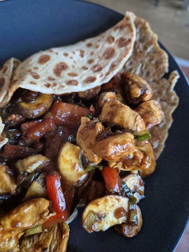 Heat a tablespoon of olive oil in a frying pan and fry the onion on low heat together with the bell pepper. Add the pieces of chicken and fry until the chicken is cooked. Add the mushrooms and continu cooking for approximately 5 minutes. Finally add the white parts of the spring onion together with a tablespoon of sweet soy sauce.